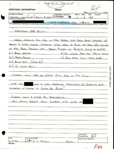 On June 3rd, 1985, exactly 5 years to the day of 8 year old Asenath Dukat's rape and murder, a man walking his dog discovered the following young girls clothing in Miller Park. Miller park is less than a mile from the location of Seannie's murder. They were found in the morning at 7:16am, were wet from dew in the grass meaning they were likely left at night: